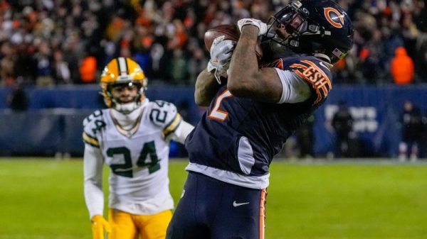 Linebacker T.J. Edwards had to be carted off with his left foot in an air cast after getting tangled up with Packers wide receiver Christian Watson. Players from the Bears’ defense stayed on the field and patted him on the shoulder pads as he was helped onto a cart and off the field.